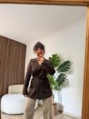 Belindeki kendi kumaşından kuşak (bağcık) detayı, belinizi sararak ince ve zarif bir silüet oluşturur. Hem ofis şıklığı için kumaş pantolonlarla hem de günlük stil için jeanlerle mükemmel uyum sağlar. Gardırobunuzun en kurtarıcı ve şık parçası olmaya aday.