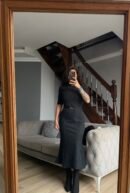 Yarım balıkçı yaka, kısa kol ve beldeki tokalı kemer detayıyla vücudu çok güzel formda gösteren triko midi elbise.