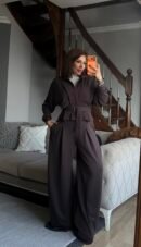 Belden kemer detaylı, oversize kesim üst ve dökümlü bol paça pantolonuyla hem konforlu hem de inanılmaz asil bir duruş sağlıyor 🤎