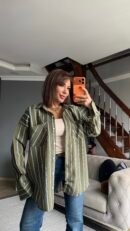 Çizgili oversize gömlek modelimiz hem tek başına hem ceket gibi kullanılabilir.