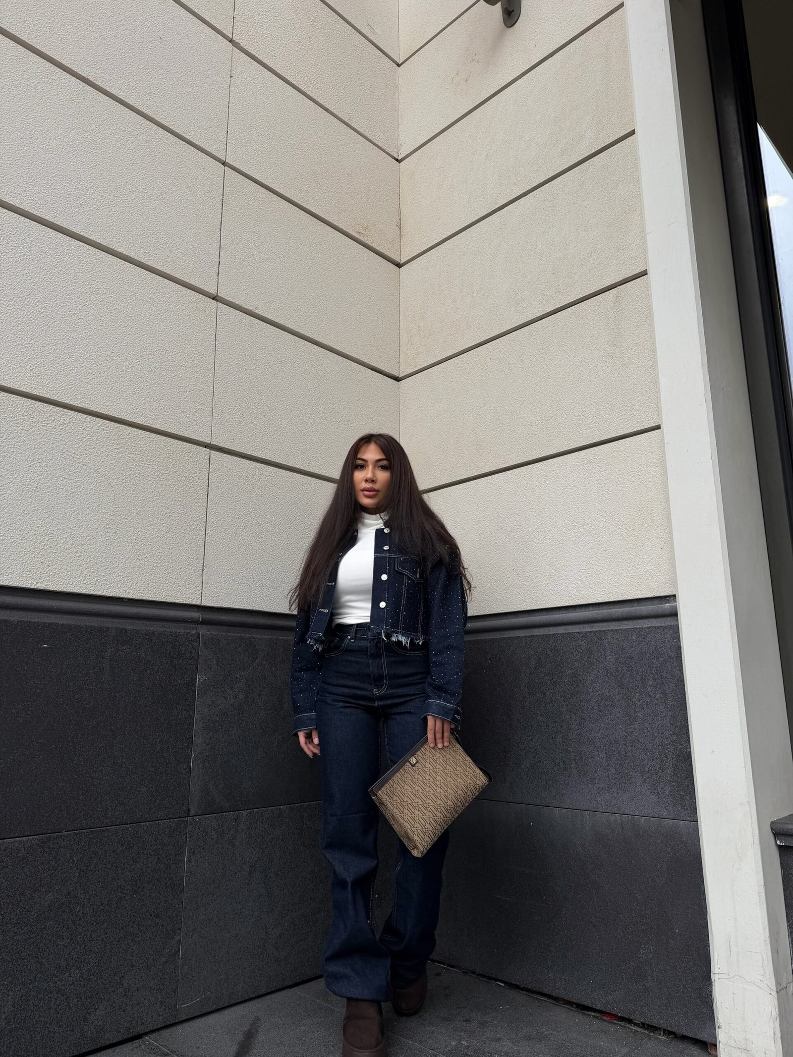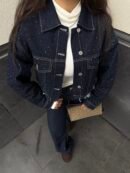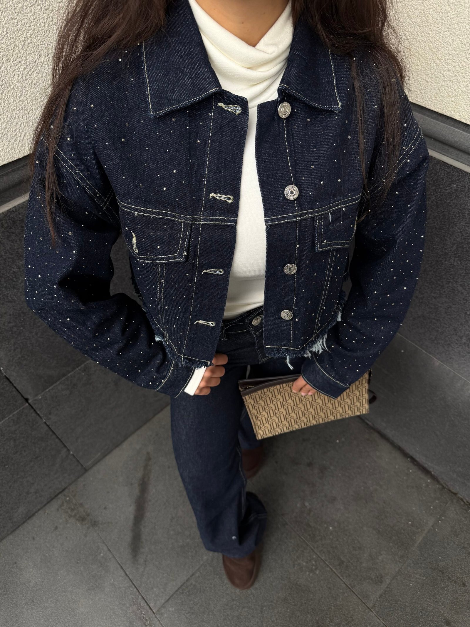 ✨ Taş detaylarıyla ışıldayan denim ceket, koyu denim flare ile birleşince ortaya tam bir “şehir şıklığı” çıktı!