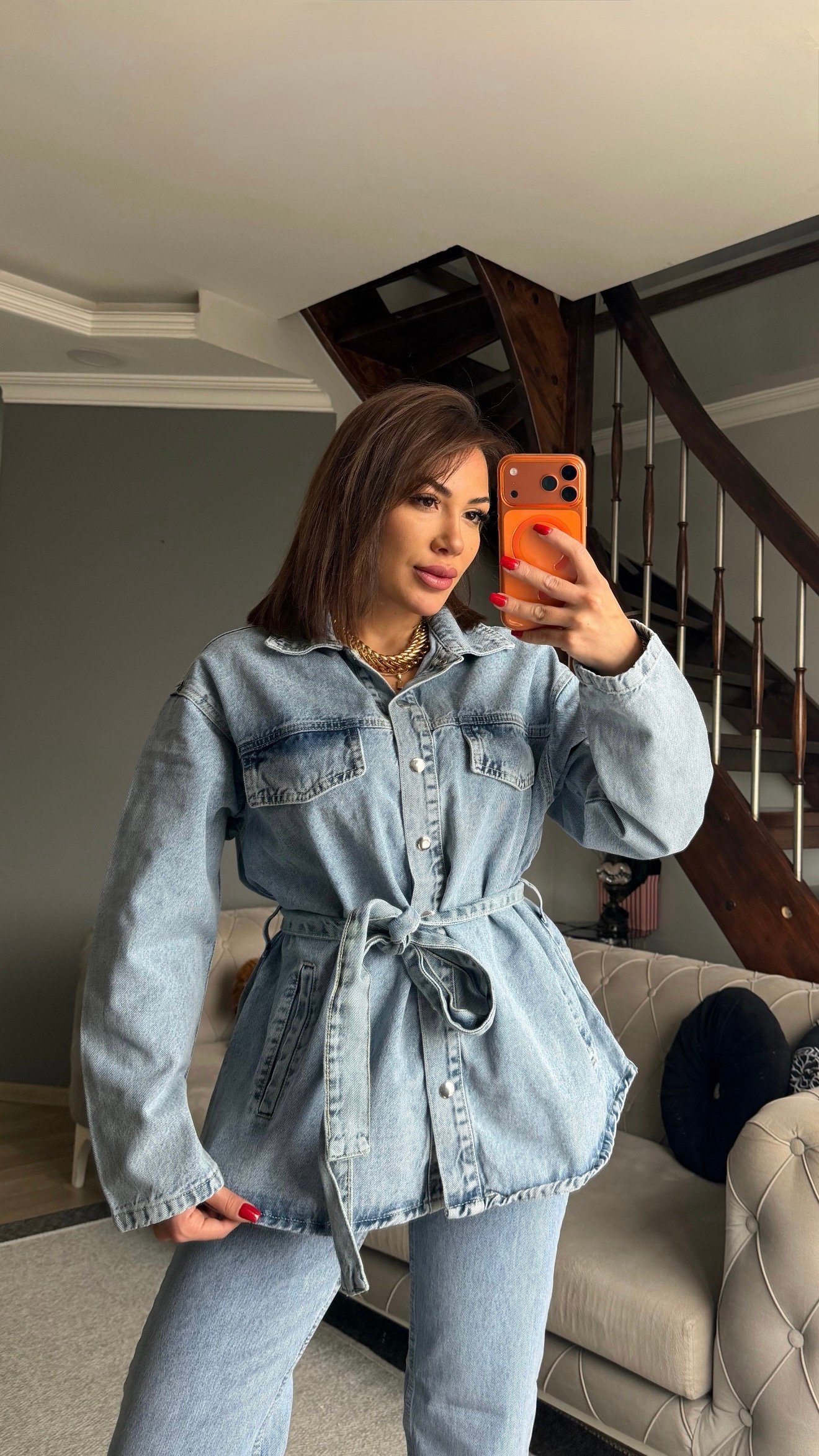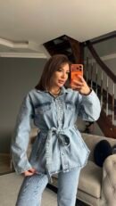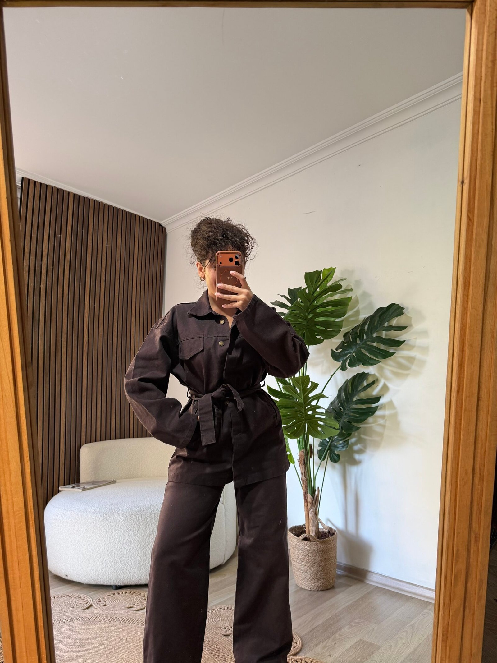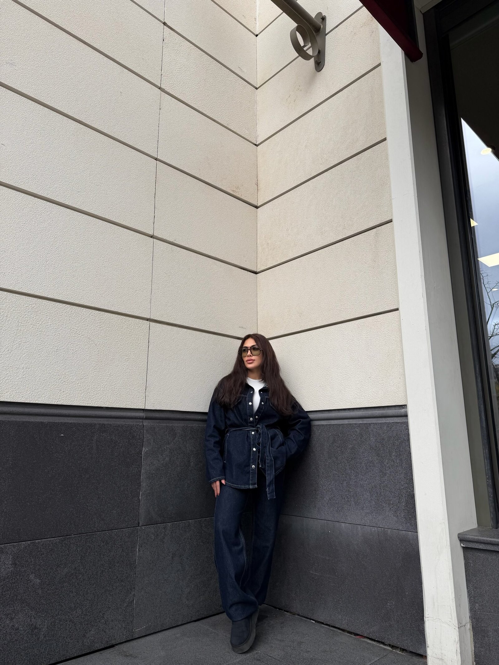 Kemer detaylı ceket belinizi zarifçe toparlarken, wide leg pantolon bacak boyunu daha uzun gösteren modern bir duruş veriyor. Gün içinde spor-şık, akşam ise daha iddialı kombinlemek çok kolay.