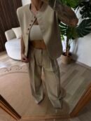 Takım; şık düğme detaylı, cepli bir yelek ve önü pileli, dökümlü palazzo pantolondan oluşur. Bej (Taş) renginin zamansız asaletiyle her ortamda dikkat çekici bir görünüm sağlar. İster takım olarak giyip güçlü bir stil yaratın, ister parçaları ayrı ayrı kombinleyerek günlük şıklık yakalayın.