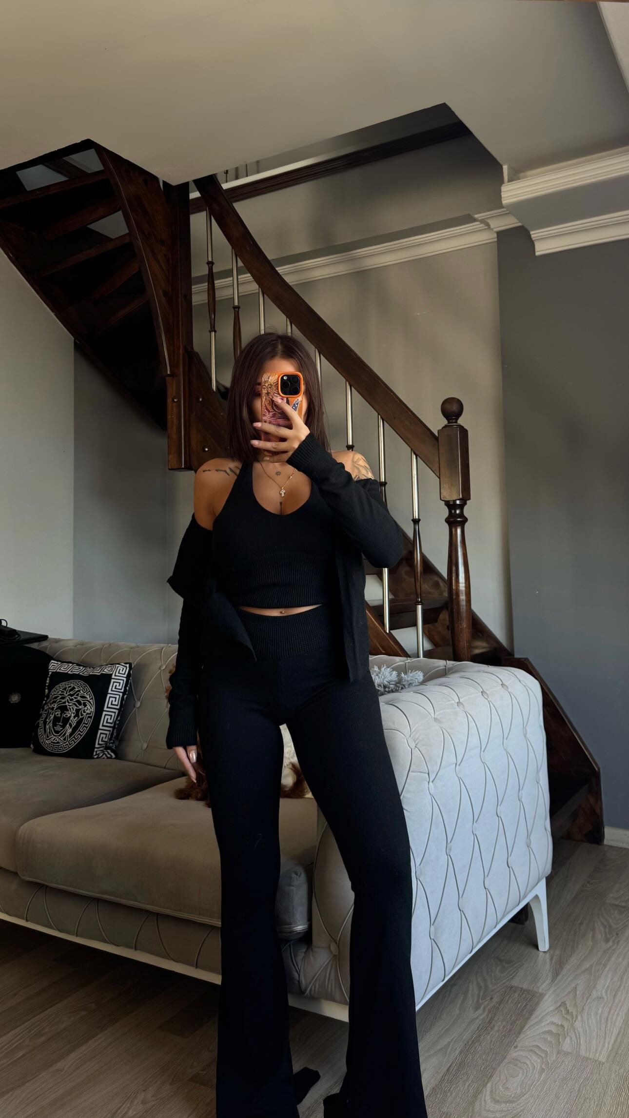 Takım; bir hırka, askılı crop top ve İspanyol paça pantolondan oluşur. Siyah ve Gri renk seçenekleriyle sunulan bu takımı ister bir arada ister ayrı ayrı parçalarla kombinleyerek sokak stili görünümünüzü tamamlayabilirsiniz.
