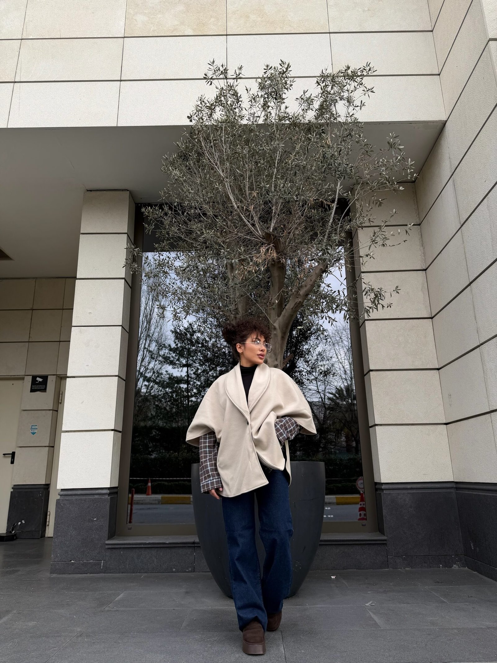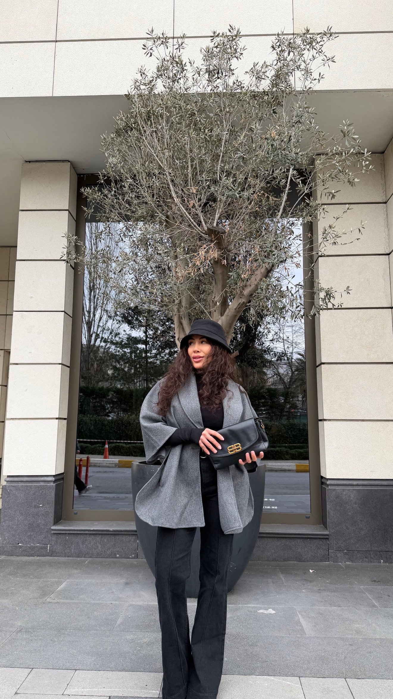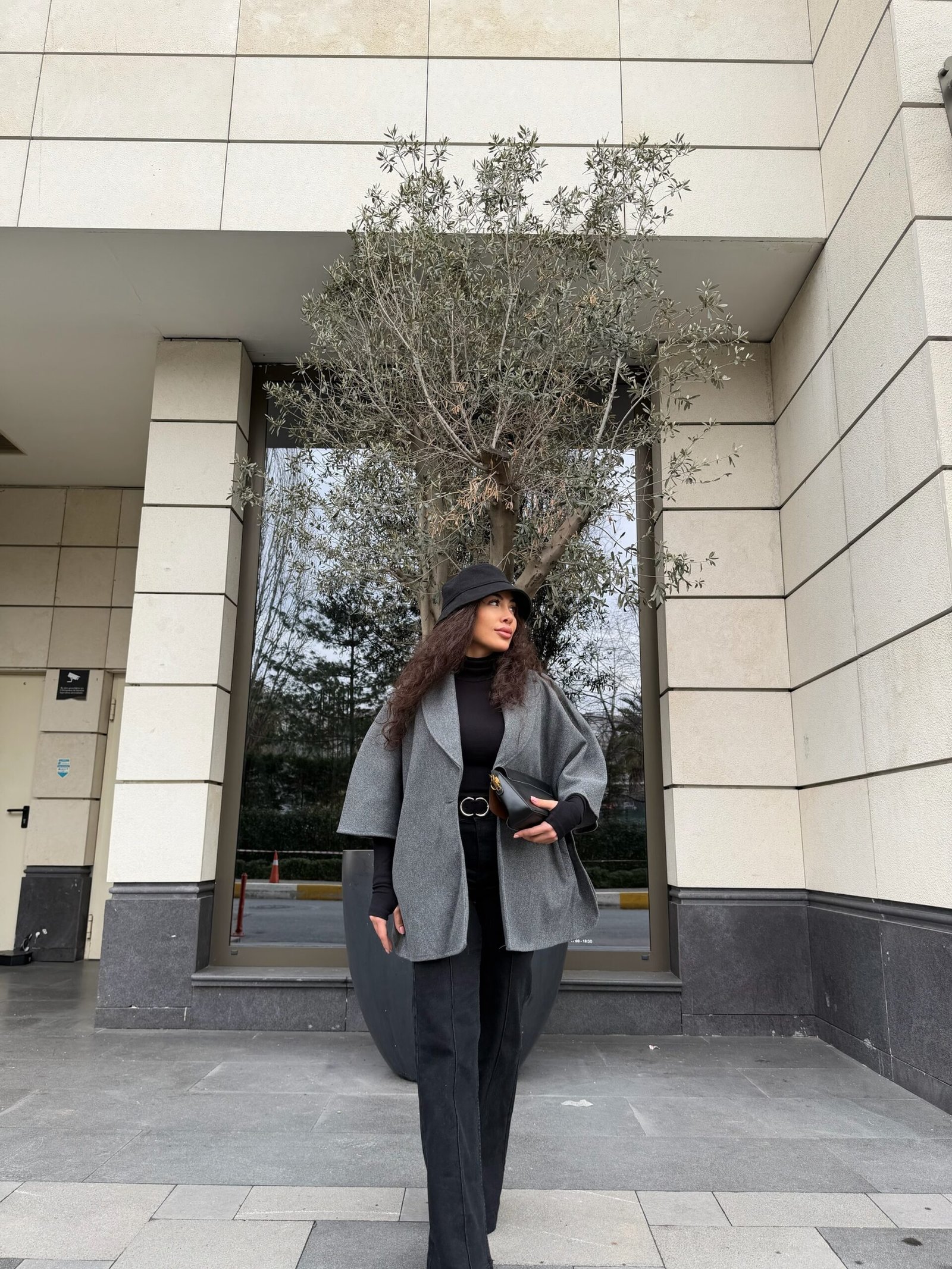 Yumuşak dokulu gri cape kaban, omuzda dökümlü duruşu ve rahat kalıbıyla hem günlük hem de şık kombinlere uyum sağlar. Siyah parçalarla güçlü bir kontrast, jean’lerle daha casual bir hava… Gün boyu konfor + stil bir arada.”