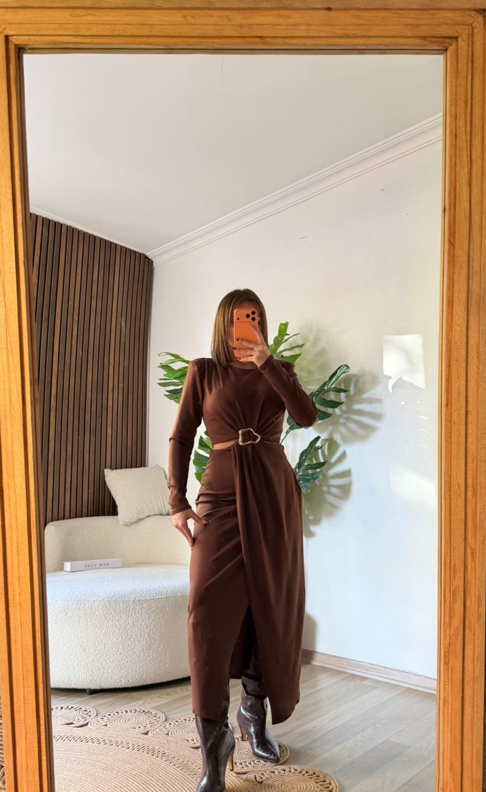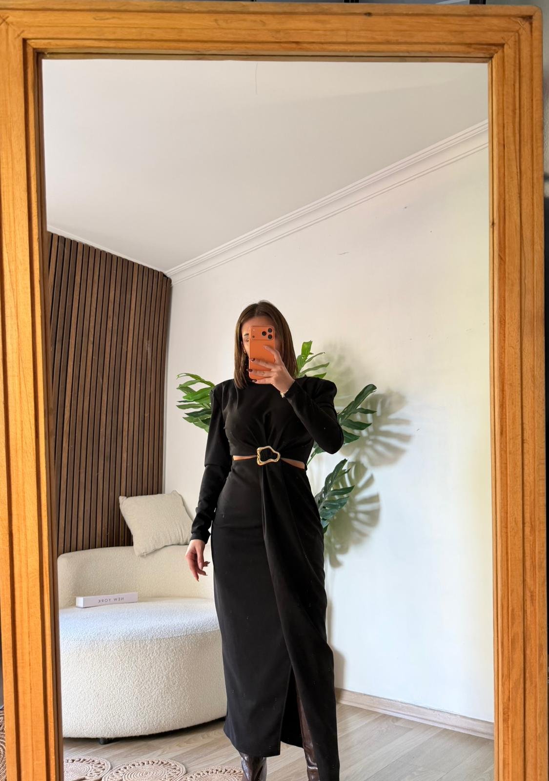 Sofistike şıklığın tanımı olan kemer detaylı vatkalı elbise ile stilinizi bir üst seviyeye taşıyın. Güçlü bir omuz duruşu sağlayan vatkalı tasarımı, uzun kollu yapısıyla sonbahar-kış sezonu için mükemmel bir seçenektir. Elbisenin en çarpıcı noktası, beli vurgulayan ve tasarıma modern bir dokunuş katan özel tasarım tokalı kemer detayıdır. Etek kısmındaki anvelop (kruvaze) kesim, zarif bir yırtmaç detayı oluşturarak feminen bir görünüm sunar. Bu uzun elbise, hem özel davetlerde hem de şık akşam yemeklerinde göz kamaştırıcı bir tercih olacaktır.