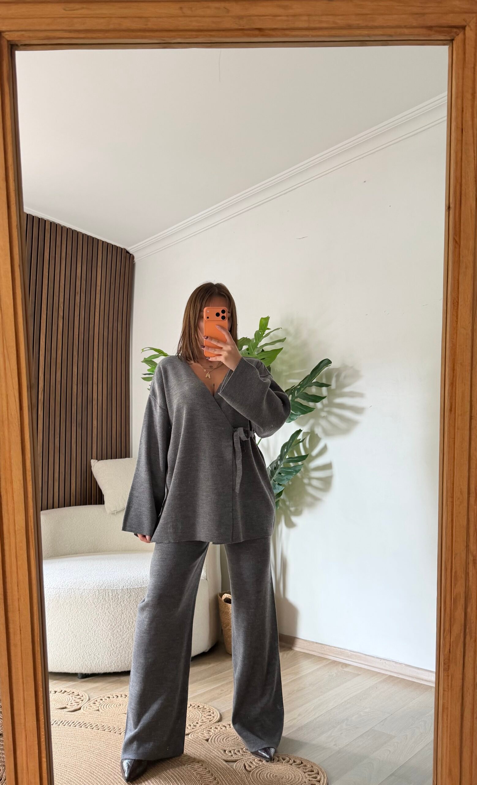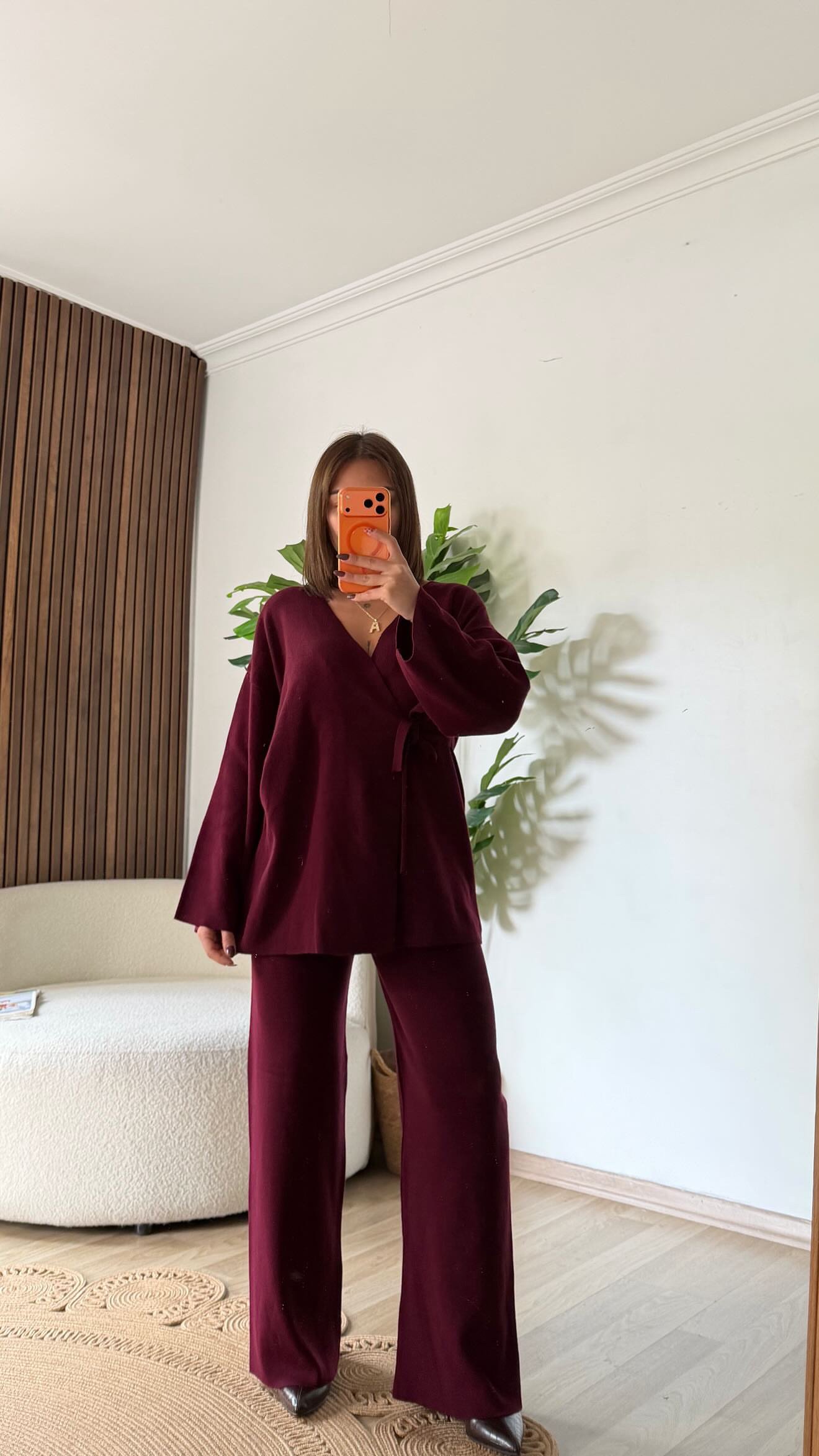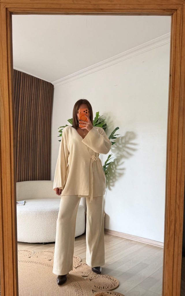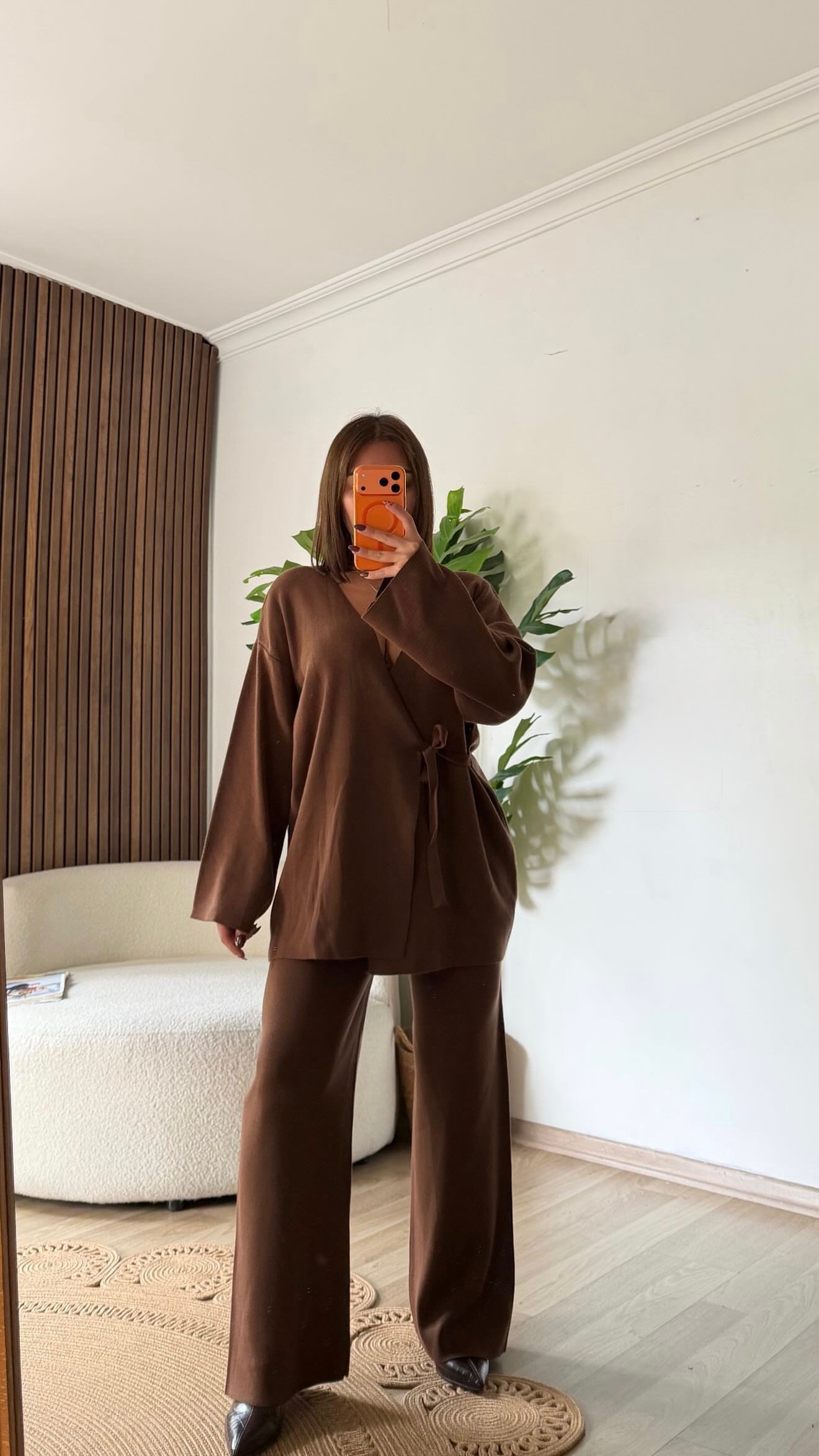 Kruvaze yaka (Anvelop) üstün bağlamalı detayı, modern bir görünüm sunarken; bol paça pantolonu gün boyu rahat giyim sağlar. Krem, Bordo ve Kahverengi renk seçenekleriyle sunulan bu takım, hem günlük şıklık hem de evde zarafet arayanlar için idealdir.