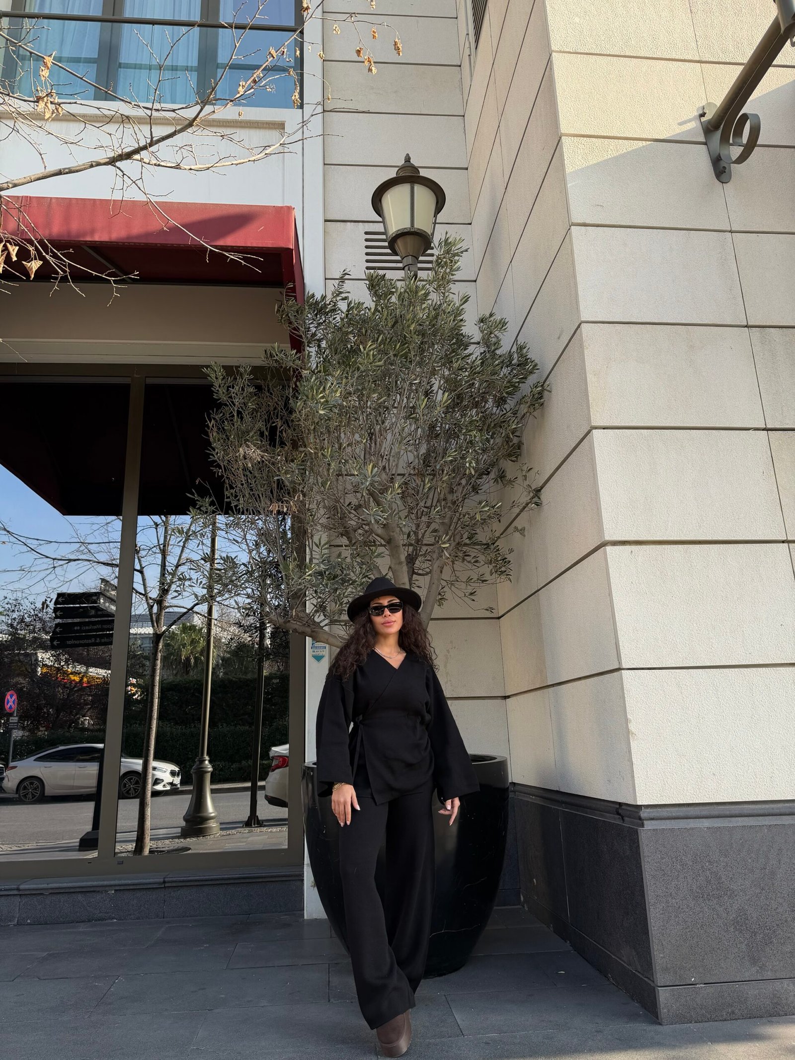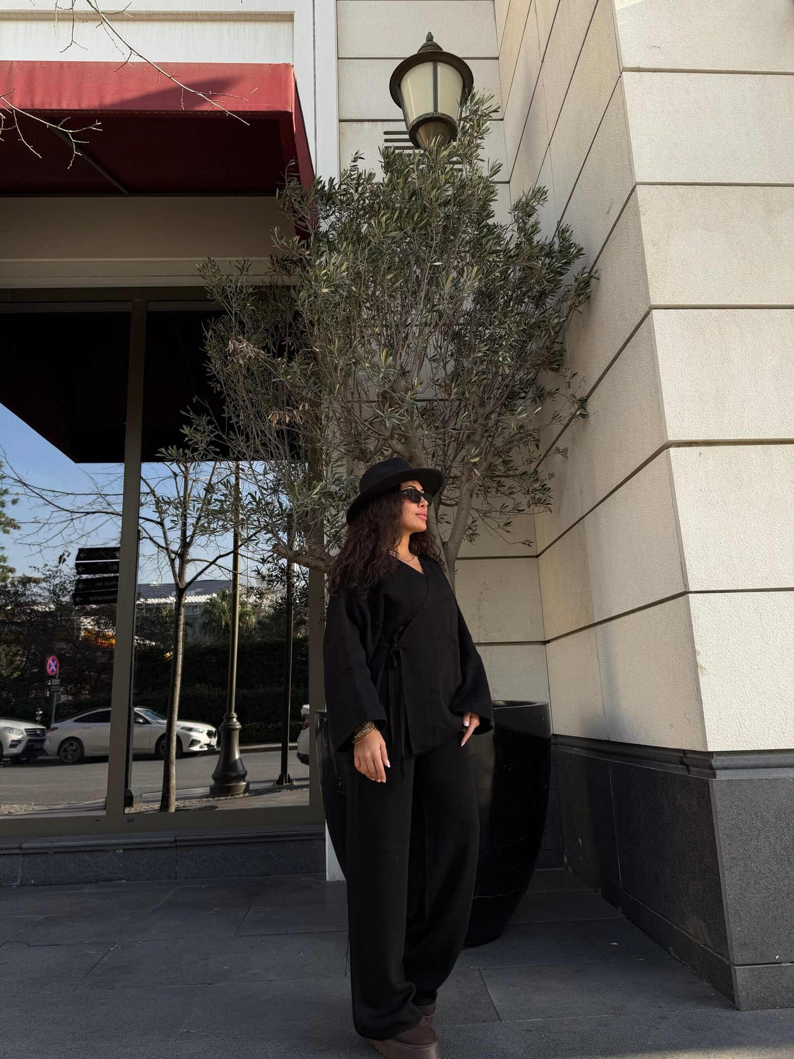 Model: Kruvaze yaka, yandan bağlamalı üst ve bol paça pantolonlu ikili takım