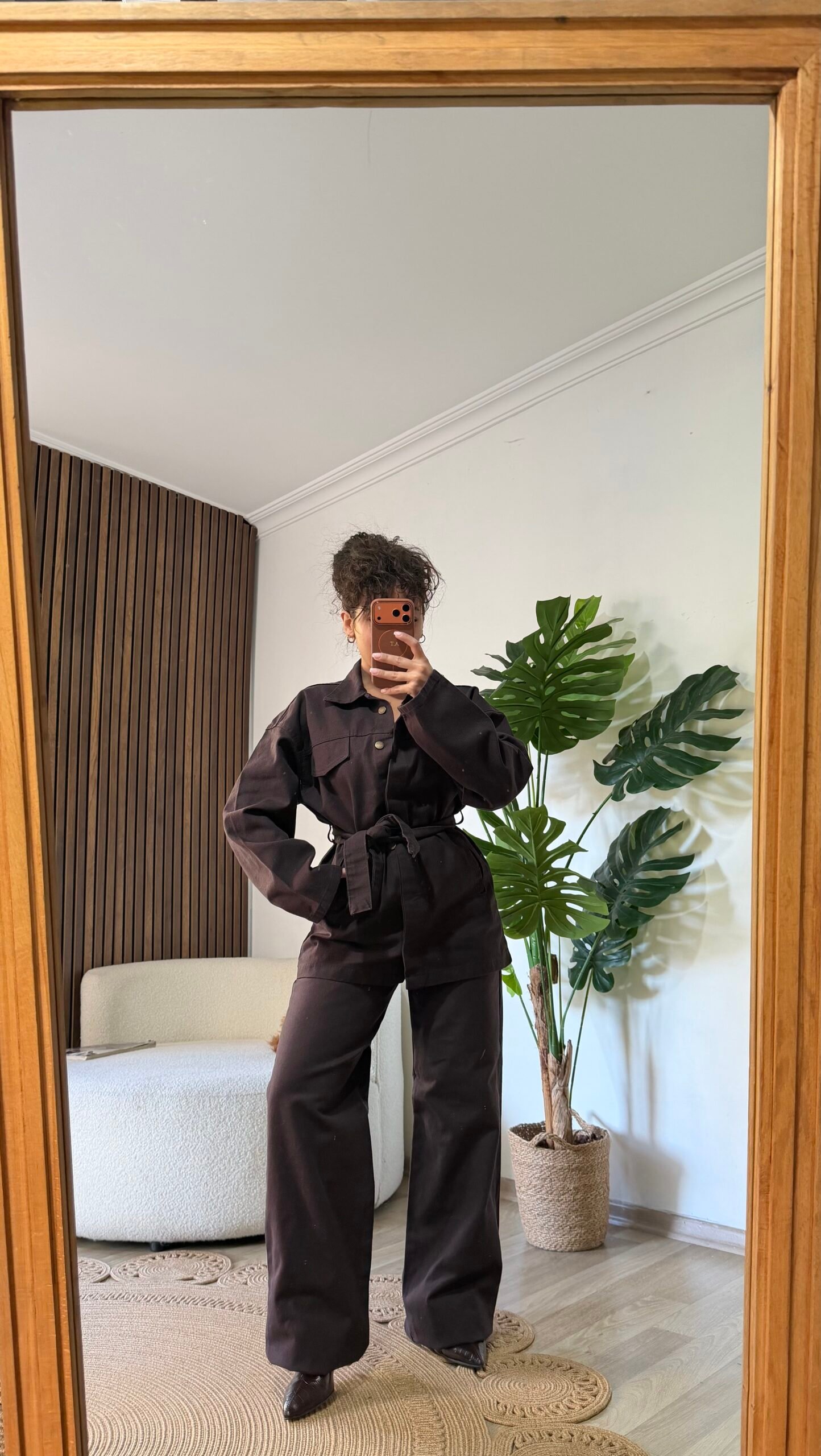 Takım; belden bağlamalı, kuşaklı, gömlek yaka bir ceket ve dökümlü bol paça bir pantolondan oluşur. İster takım olarak giyerek bütünlüklü bir şıklık yakalayın, ister parçaları ayrı ayrı kullanarak farklı kombinler oluşturun.
