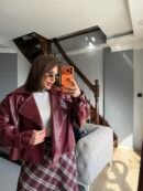 Siyah rengin asaletiyle birleşen bu suni deri ceket, geniş yaka kesimi ve beli vurgulayan kalıbıyla modern bir duruş sağlar. Hem günlük şıklık hem de sokak stili için mükemmel bir tamamlayıcıdır.