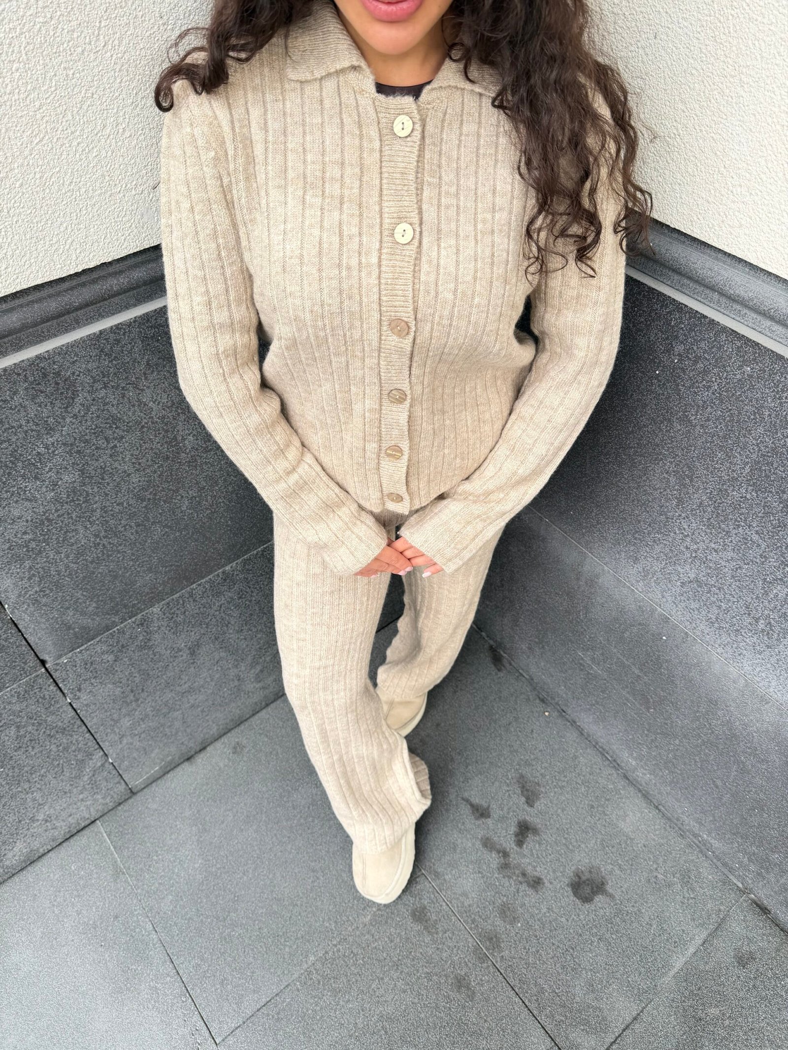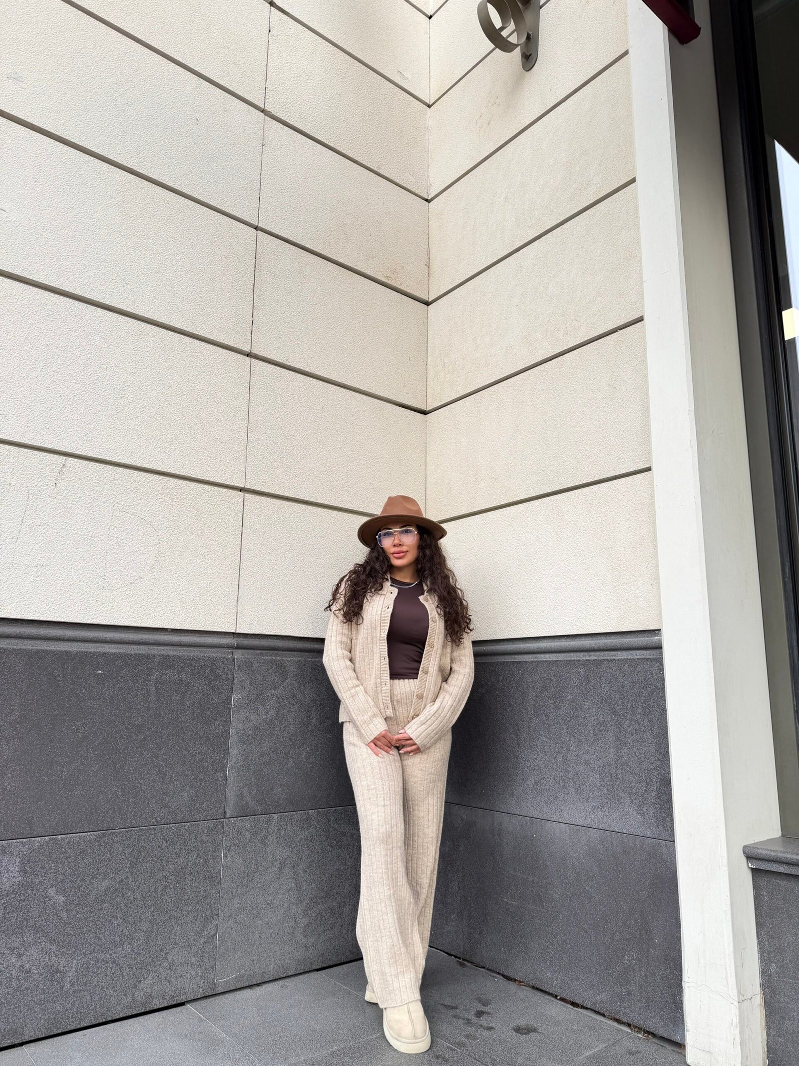 Bej triko takım, zarif dokusu ve fit kalıbıyla sade şıklığın tanımı.